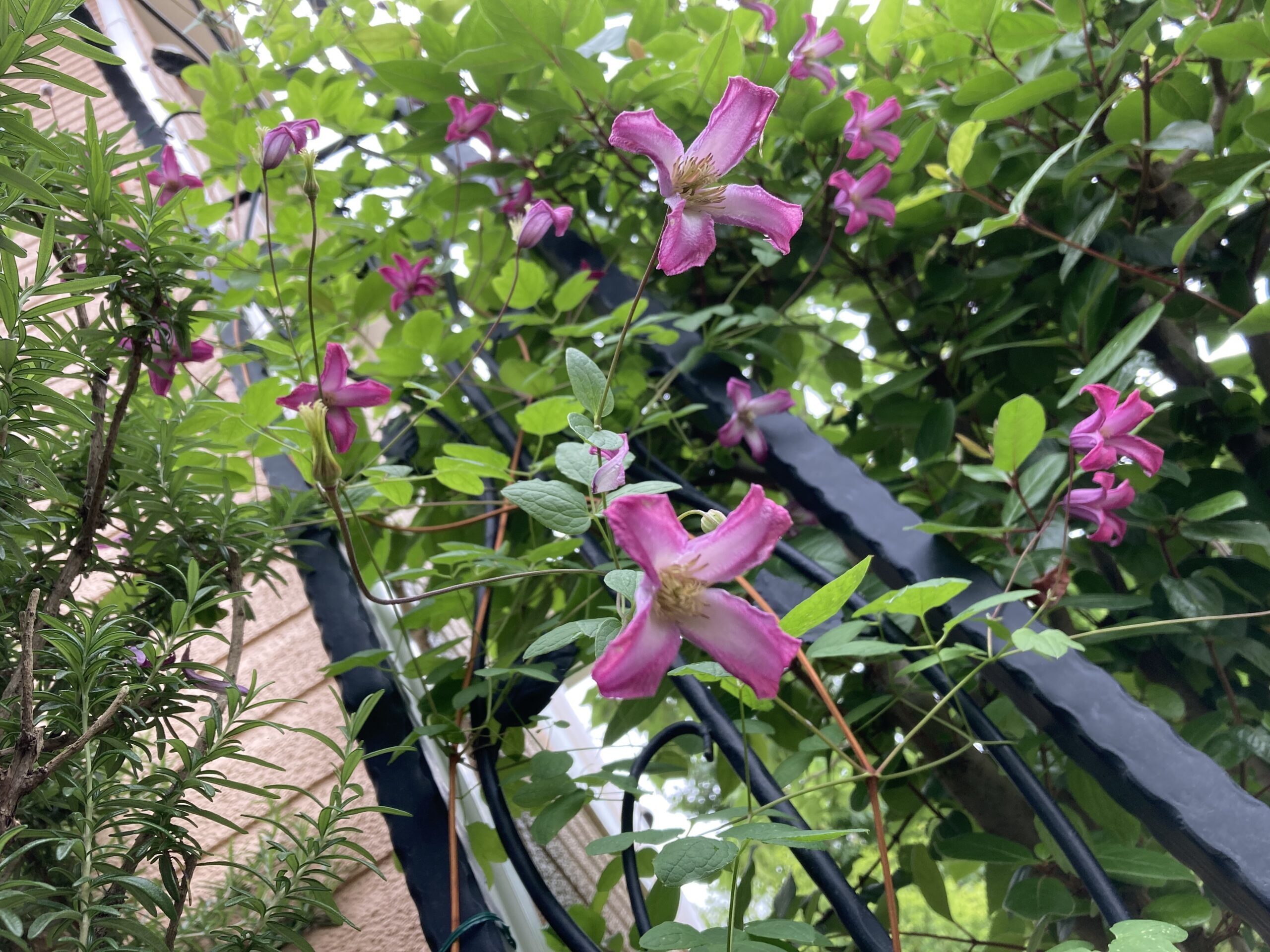 ②アイアンのアーチに誘引されている釣鐘型のクレマチスは、色鮮やかな可愛いらしいお花をたくさん咲かせ、素敵な通路のアクセントとして、お庭に見応えのある雰囲気を演出しているようでした。