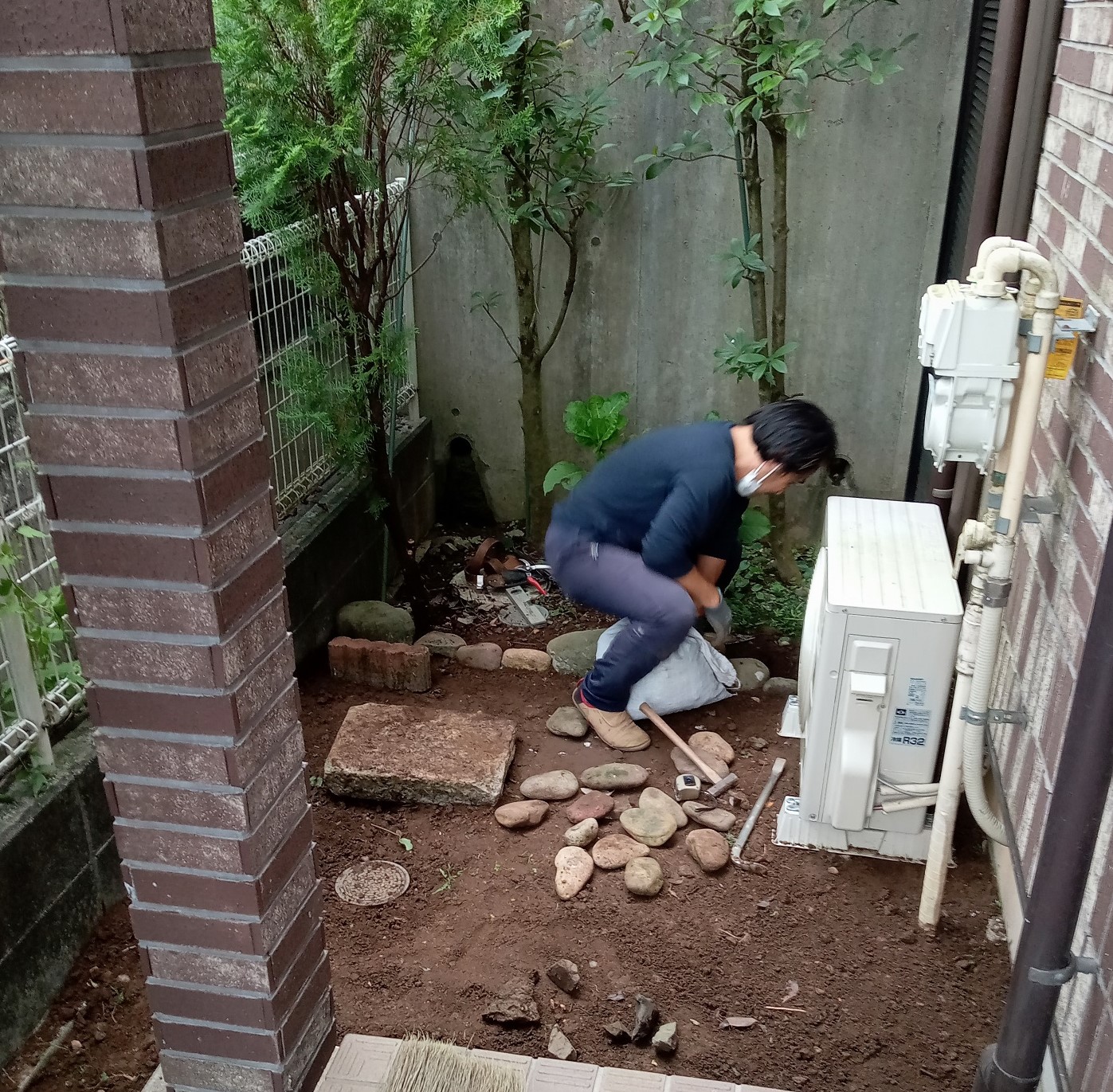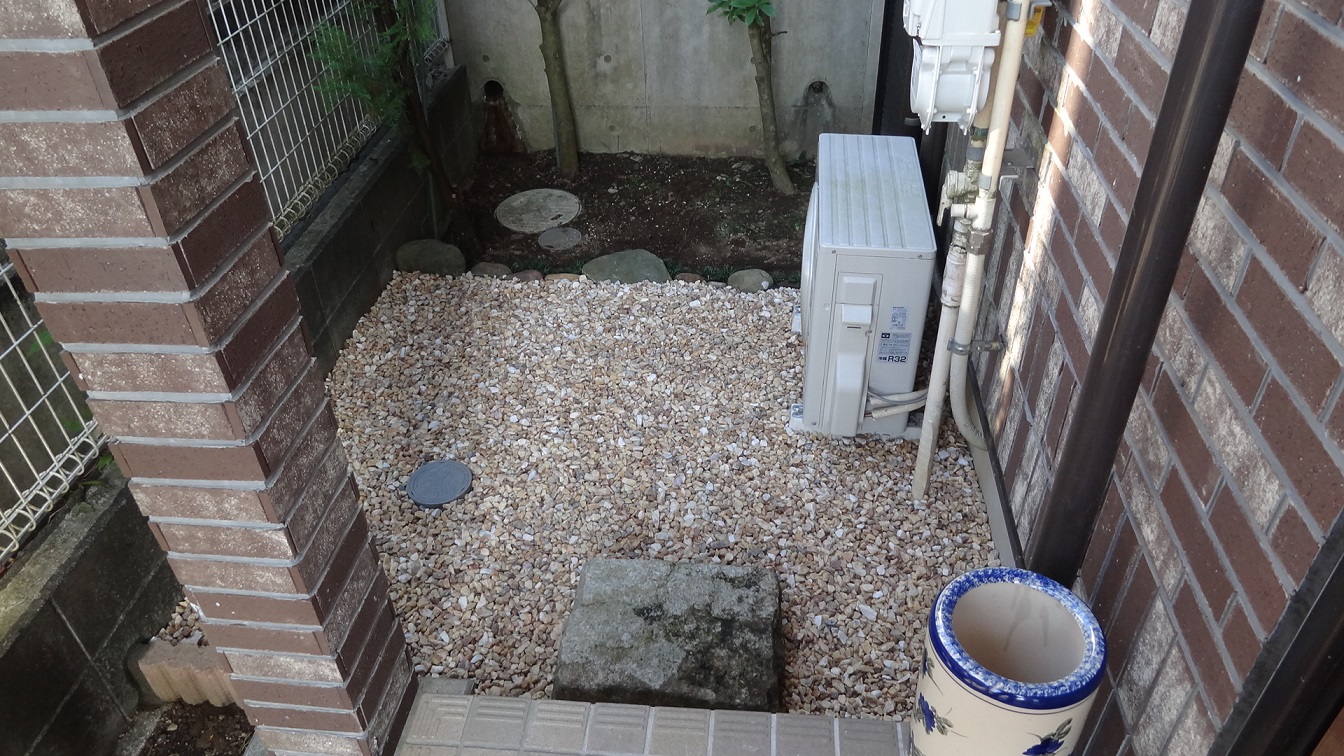 まず、ジメジメの土と雑草を取り除き、地面を平にした後にお客様がお持ちのブロックや、石を再利用させてもらって、それから防草シートを張りその上に砂利を敷き詰めました。