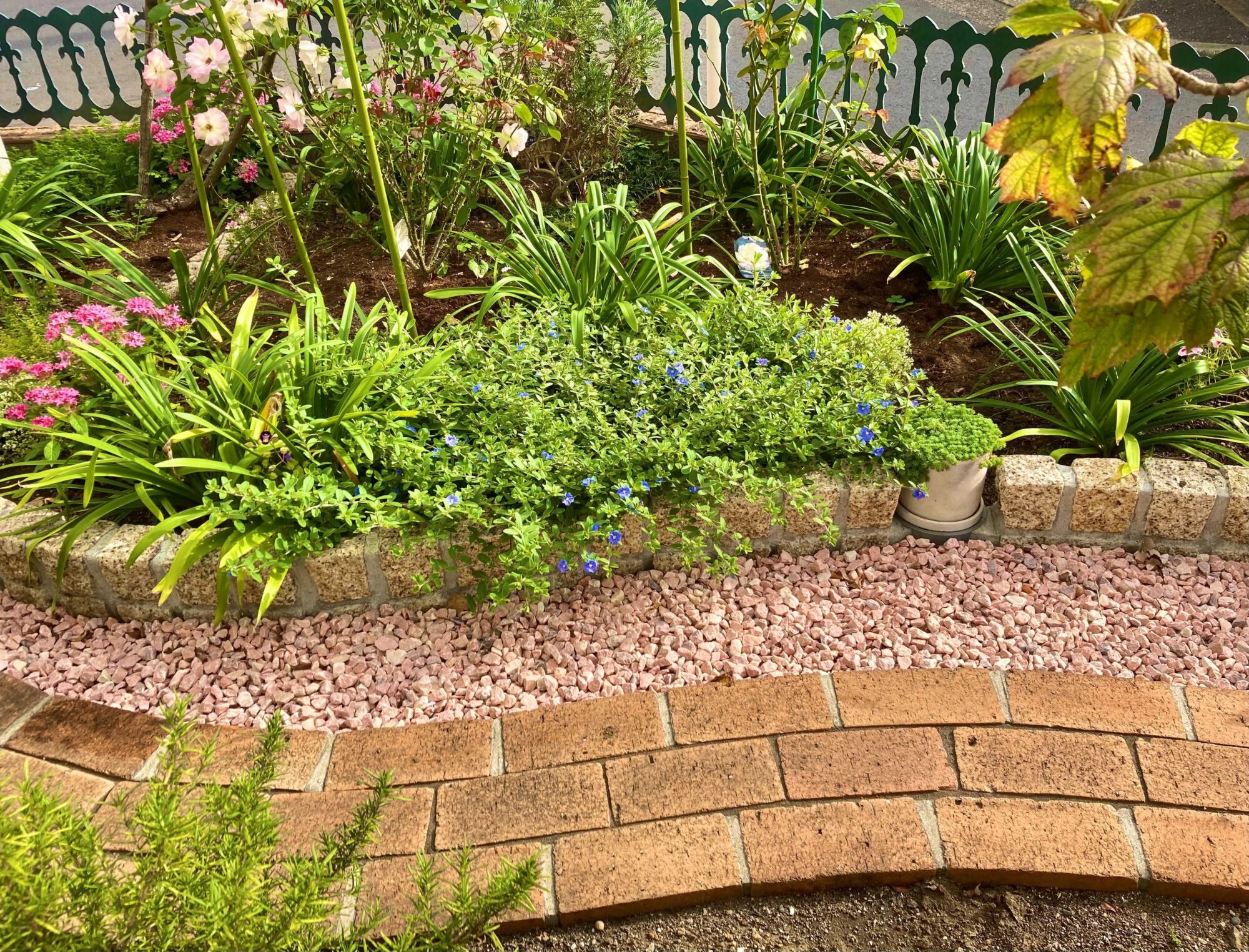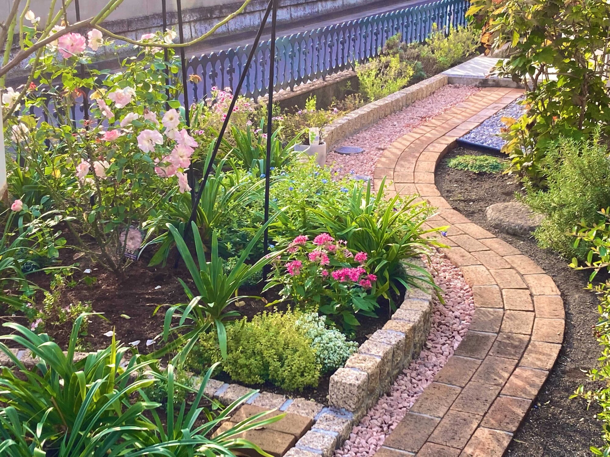 お客様からは、花壇全体に手が届かない所がないという機能面や、既存の植物たちも上手く配置して、大事なお役目を与えてくれたことをお喜びいただき、お花いじりをお楽しみになられているという、本当にありがたいお言葉を頂戴しました。
