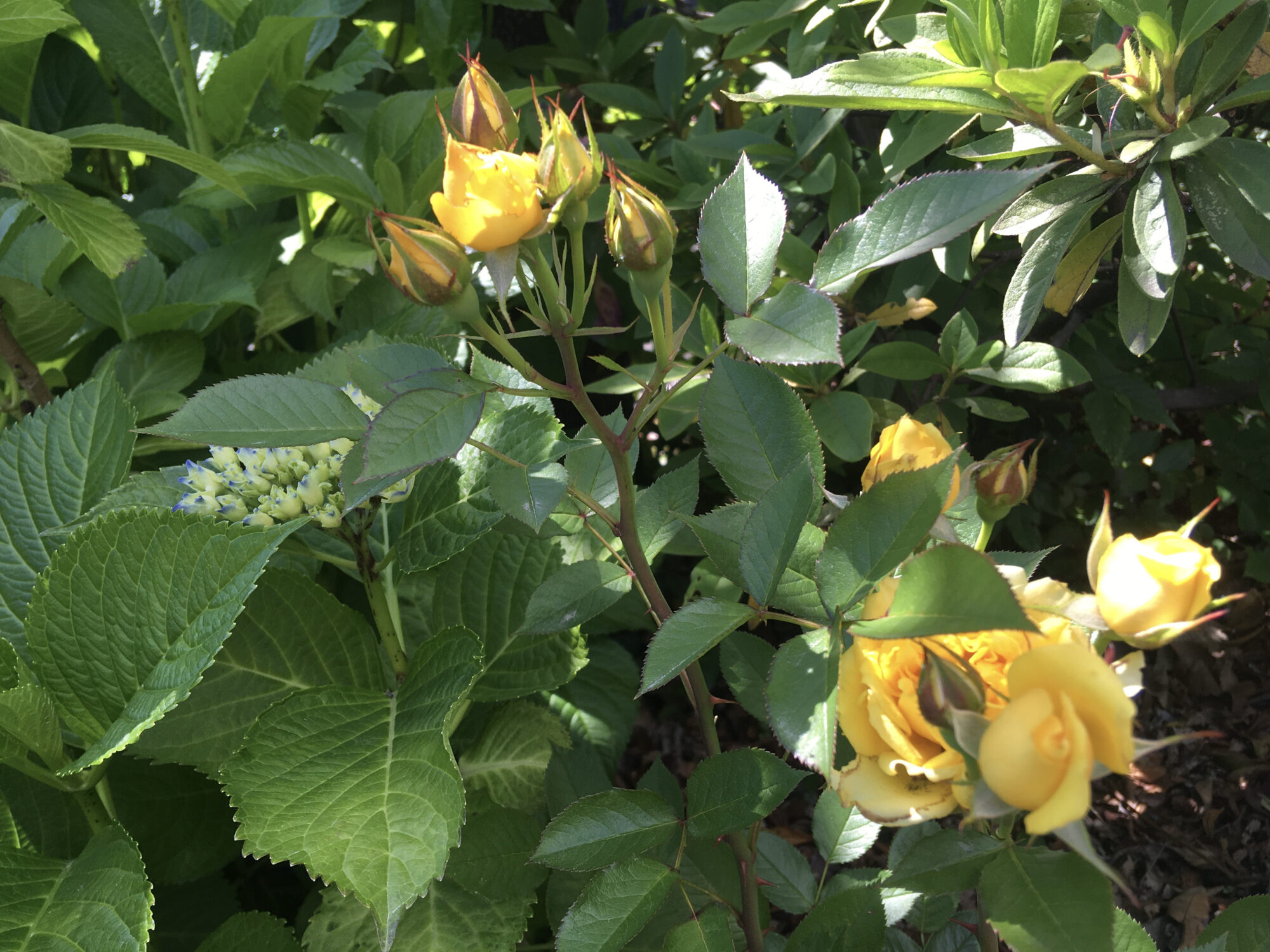 黄色やピンクのミニバラやサルビア・オフィキナリス(Salvia officinalis)が次々と開花し、