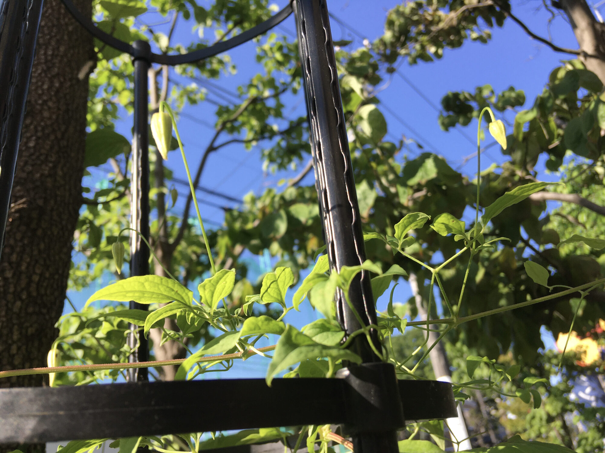 釣鐘型のお花で新枝咲きのクレマチス(※ちなみに花色は白色です)、その他、アジサイ、ブラックベリーなどが